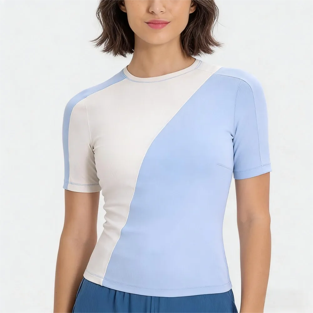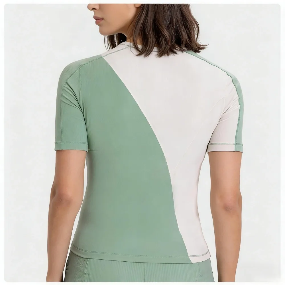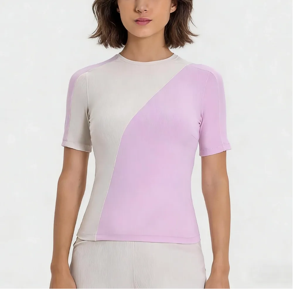 Elevate your workout wardrobe with a splash of modern flair. Featuring a sleek diagonal color-block design that visually sculpts your silhouette, this tee is crafted from advanced cooling fibers for instant heat relief. From yoga flows to coffee runs, stay breezy, dry, and effortlessly chic.